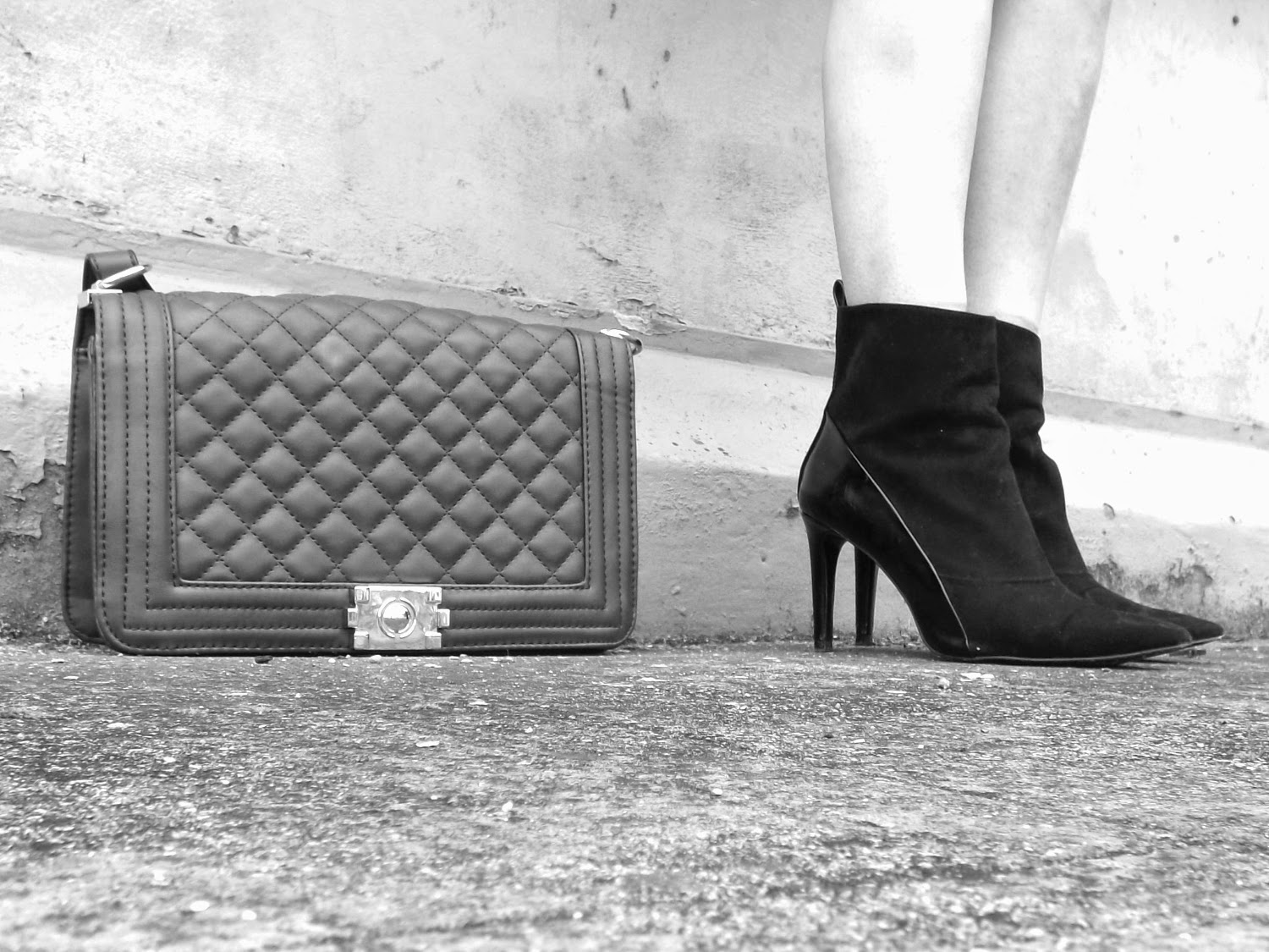 Para darle fuerza al look, he optado por una mini de cuero y botines de tacón de aguja y para añadirle un toque más sofisticado le he añadido mi bolso clon de Chanel.